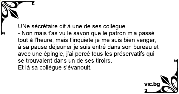 - Non mais t'as vu le savon que le patron m'a passé tout à l'heure, mais t'inquiete je me suis bien venger, à sa pause déjeuner je suis entré dans son bureau et avec une épingle, j'ai percé tous les préservatifs qui se trouvaient dans un de ses tiroirs.