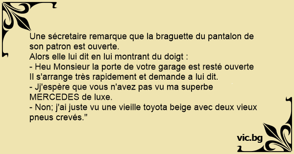 Opgemerkt dat de broek van haar baas openstond, zegt de secretaresse gegeneerd: 'De poort van uw garage is blijven openstaan' De baas verstomd begrijpt niets van wat ze zegt tot ze naar zijn...