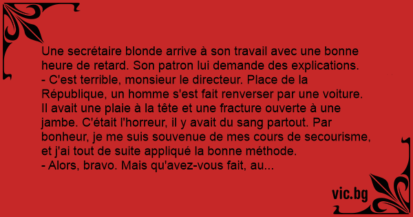- C'est terrible, monsieur le directeur. Place de la République, un homme s'est fait renverser par une voiture. Il avait une plaie à la tête et une fracture ouverte à une jambe. C'était l'horreur, il y avait du sang partout. Par bonheur, je me suis souvenue de mes cours de secourisme, et j'ai tout de suite appliqué la воnnе méthode.
