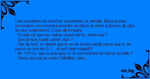 Une secrétaire de direction va prendre sa retraite. Deux jeunes secrétaires qui espèrent prendre sa place se tirent la bourre de plus en plus violemment. L'une dit à l'autre: