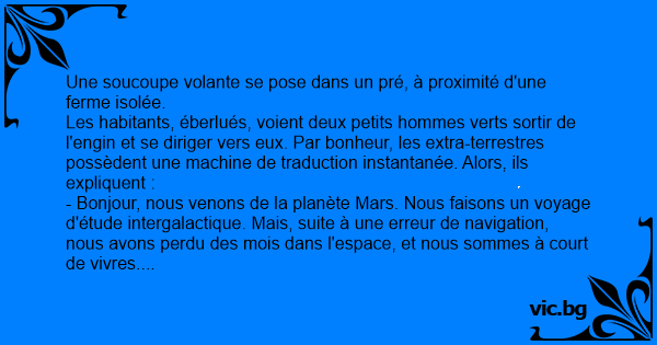 - Bonjour, nous venons de la planète Mars. Nous faisons un voyage d'étude intergalactique. Mais, suite à une erreur de navigation, nous avons perdu des mois dans l'espace, et nous sommes à court de vivres. Pourriez-vous nous dépanner ?