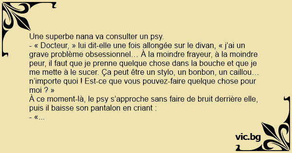 - « Docteur, » lui dit-elle une fois allongée sur le divan, « j’ai un grave problème obsessionnel… À la moindre frayeur, à la moindre peur, il faut que je prenne quelque chose dans la bouche et que je me mette à le sucer. Ça peut être un stylo, un bonbon, un caillou… n’importe quoi ! Est-ce que vous pouvez-faire quelque chose pour moi ? »