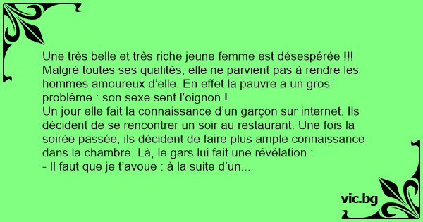 Une très belle et très riche jeune femme est désespérée !!! Malgré toutes ses qualités, elle ne parvient pas à rendre les hommes amoureux d’elle. En effet la pauvre a un gros problème : son sexe sent l’oignon !
