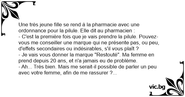 Une très jeune fille se rend à la pharmacie avec une ordonnance pour la pilule. Elle dit au pharmacien :