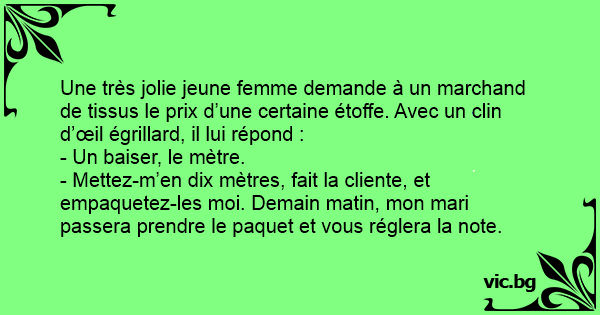 Une très jolie jeune femme demande à un marchand de tissus le prix d’une certaine étoffe. Avec un clin d’œil égrillard, il lui répond :