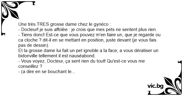 - Docteur! je suis affolée : je crois que mes pets ne sentent plus rien.