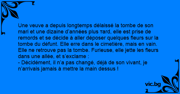Une veuve a depuis longtemps délaissé la tombe de son mari et une dizaine d’années plus таrd, elle est prise de remords et se décide à aller déposer quelques fleurs sur la tombe du défunt. Elle erre dans le cimetière, mais en vain. Elle ne retrouve pas la tombe. Furieuse, elle jette les fleurs dans une allée, et s’exclame :