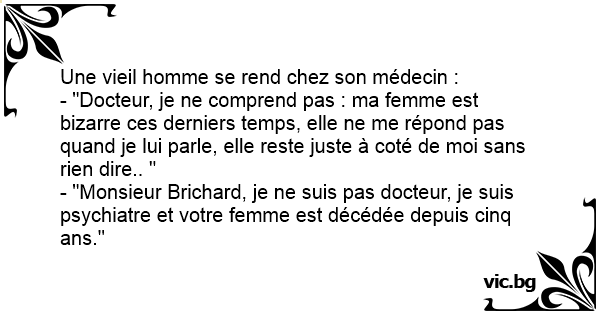 - "Monsieur Brichard, je ne suis pas docteur, je suis psychiatre et votre femme est décédée depuis cinq ans."