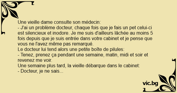 - Docteur, je ne sais pas ce que vous m'avez donné mais autant mes pets sont toujours aussi silencieux, ,autant ils ont une odeur horrible et insoutenable désormais !