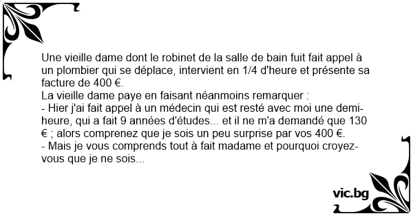 Une vieille dame dont le robinet de la salle de bain fuit fait appel à un plombier qui se déplace, intervient en 1/4 d'heure et présente sa facture de 400 €.
