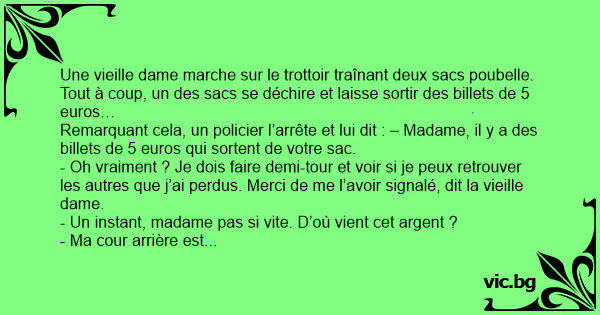 Remarquant cela, un policier l’arrête et lui dit : – Madame, il y a des billets de 5 euros qui sortent de votre sac.