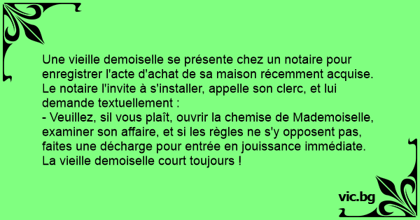 Une vieille demoiselle se présente chez un notaire pour enregistrer l'acte d'achat de sa maison récemment acquise. Le notaire l'invite à s'installer, appelle son clerc, et lui demande textuellement :