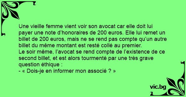 Une vieille femme vient voir son avocat car elle doit lui payer une note d’honoraires de 200 euros. Elle lui remet un billet de 200 euros, mais ne se rend pas compte qu’un autre billet du même montant est resté collé au premier.