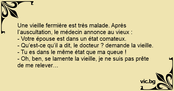 Une vieille fermière est très malade. Après l’auscultation, le médecin annonce au vieux :