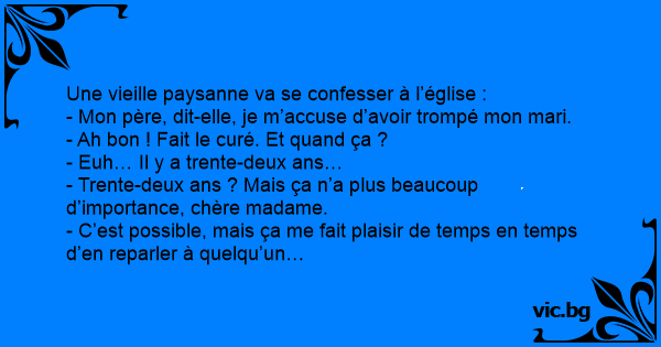 Une vieille paysanne va se confesser à l’église :