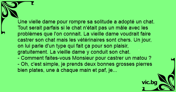 Une vielle dame pour rompre sa solitude a adopté un chat. Tout serait parfais si le chat n'était pas un mâle avec les problèmes que l'on connait. La vieille dame voudrait faire castrer son chat mais les vétérinaires sont chers. Un jour, on lui parle d'un type qui fait ça pour son plaisir, gratuitement. La vieille dame y conduit son chat.
