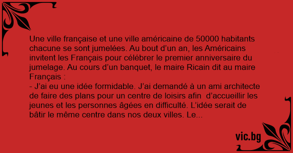 Une ville française et une ville américaine de 50000 habitants chacune se sont jumelées. Au bout d’un an, les Américains invitent les Français pour célébrer le premier anniversaire du jumelage. Au cours d’un banquet, le maire Ricain dit au maire Français :
