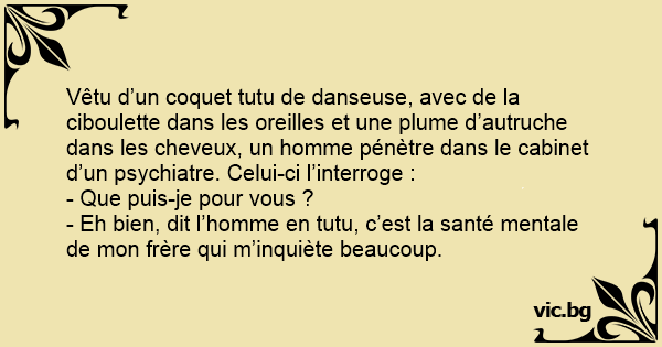 Vêtu d’un coquet tutu de danseuse, avec de la ciboulette dans les oreilles et une plume d’autruche dans les cheveux, un homme pénètre dans le cabinet d’un psychiatre. Celui-ci l’interroge :