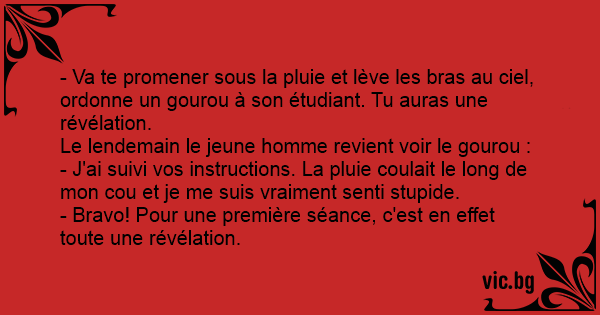 - Va te promener sous la pluie et lève les bras au ciel, ordonne un gourou à son étudiant. Tu auras une révélation.