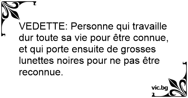 VEDETTE: Personne qui travaille dur toute sa vie pour être connue, et qui porte ensuite de grosses lunettes noires pour ne pas être reconnue.
