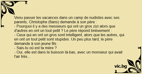 Venu passer les vacances dans un camp de nudistes avec ses parents, Christophe (6ans) demande à son père :