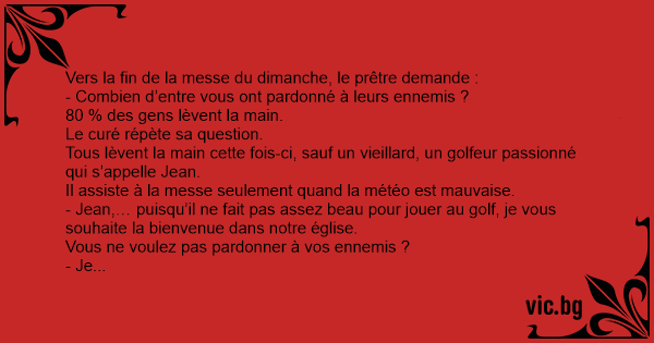 - Jean,… puisqu’il ne fait pas assez beau pour jouer au golf, je vous souhaite la bienvenue dans notre église.