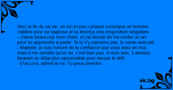 - Écoutez, répond ce sage, en 5 années, il peut se passer beaucoup de choses : premièrement, le roi peut mourir, il est si vieux. Deuxièmement, je peux mourir, moi aussi. Troisièmement, le chien peut mourir. Et quatrièmement, peut-être que malgré tout, en 5 ans, je pourrai apprendre à parler à ce chien...