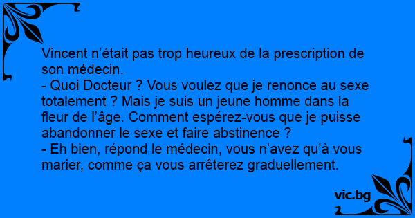 - Quoi Docteur ? Vous voulez que je renonce au sexe totalement ? Mais je suis un jeune homme dans la fleur de l’âge. Comment espérez-vous que je puisse abandonner le sexe et faire abstinence ?