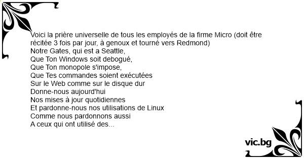 Voici la prière universelle de tous les employés de la firme Micro (doit être récitée 3 fois par jour, à genoux et tourné vers Redmond)