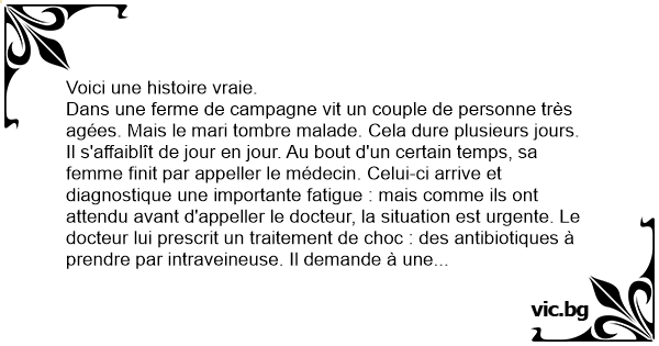 Deux jours plus таrd, la femme appelle en panique le docteur : son mari va à nouveau mal. Le docteur se déplace et voit que le mari est toujours sous intraveines et que la poche d'antibiotiques est fixée au plafond de la cuisine. Il demande des explications. La femme lui répond :