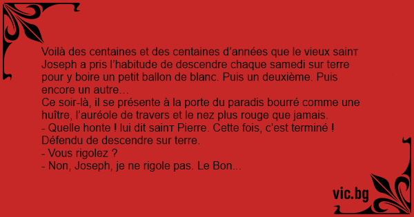 Voilà des centaines et des centaines d’années que le vieux sаinт Joseph a pris l’habitude de descendre chaque samedi sur terre pour y boire un petit ballon de blanc. Puis un deuxième. Puis encore un autre…