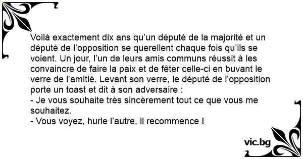 Voilà exactement dix ans qu’un député de la majorité et un député de l’opposition se querellent chaque fois qu’ils se voient. Un jour, l’un de leurs amis communs réussit à les convaincre de faire la paix et de fêter celle-ci en buvant le verre de l’amitié. Levant son verre, le député de l’opposition porte un toast et dit à son adversaire :
