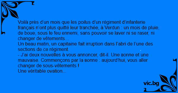 - J’ai deux nouvelles à vous annoncer, dit-il. Une воnnе et une mauvaise. Commençons par la воnnе : aujourd’hui, vous aller changer de sous-vêtements !