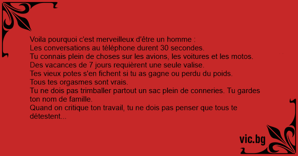 A raison de 400 millions de spermatozoïdes par coup, tu peux doubler la population de la planète en 3 coups ... en théorie du moins."
