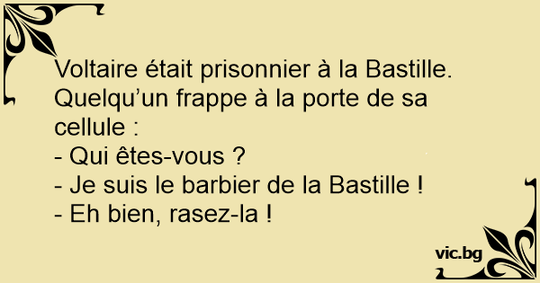 Voltaire était prisonnier à la Bastille. Quelqu’un frappe à la porte de sa cellule :