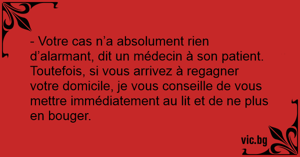 - Votre cas n’a absolument rien d’alarmant, dit un médecin à son patient. Toutefois, si vous arrivez à regagner votre domicile, je vous conseille de vous mettre immédiatement au lit et de ne plus en bouger.