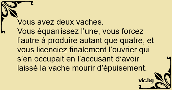 Vous équarrissez l’une, vous forcez l’autre à produire autant que quatre, et vous licenciez finalement l’ouvrier qui s’en occupait en l’accusant d’avoir laissé la vache mourir d’épuisement.