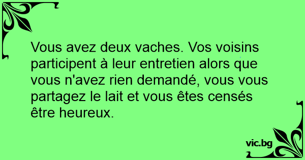 Vous avez deux vaches. Vos voisins participent à leur entretien alors que vous n'avez rien demandé, vous vous partagez le lait et vous êtes censés être heureux.