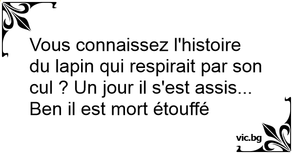 Vous connaissez l'histoire du lapin qui respirait par son cul ? Un jour il s'est assis... Ben il est mort étouffé