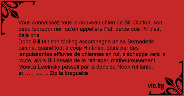 Donc Bill fait son footing accompagné de sa Bernadette canine, quand tout à coup Rintintin, attiré par des languissantes effluves de chiennes en rut, s’échappe vers la route, alors Bill essaie de le rattraper, malheureusement Monica Lewinsky passait par là dans sa Néon rutilante, et………….. Zip la braguette