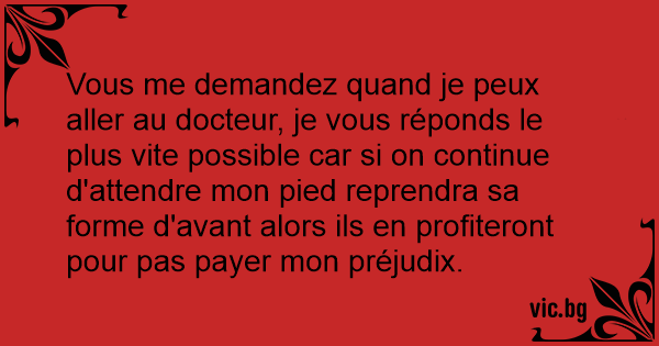 Vous me demandez quand je peux aller au docteur, je vous réponds le plus vite possible car si on continue d'attendre mon pied reprendra sa forme d'avant alors ils en profiteront pour pas payer mon préjudix.
