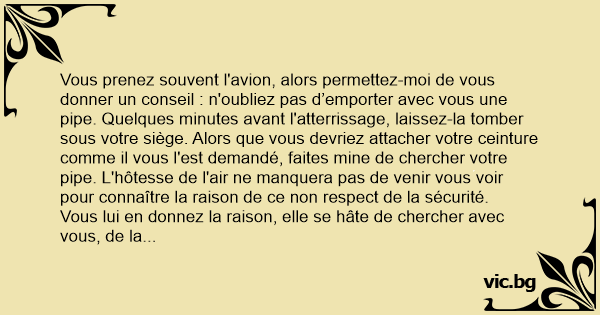 Vous prenez souvent l'avion, alors permettez-moi de vous donner un conseil : n'oubliez pas d’emporter avec vous une pipe. Quelques minutes avant l'atterrissage, laissez-la tomber sous votre siège. Alors que vous devriez attacher votre ceinture comme il vous l'est demandé, faites mine de chercher votre pipe. L'hôtesse de l'air ne manquera pas de venir vous voir pour connaître la raison de ce non respect de la sécurité.