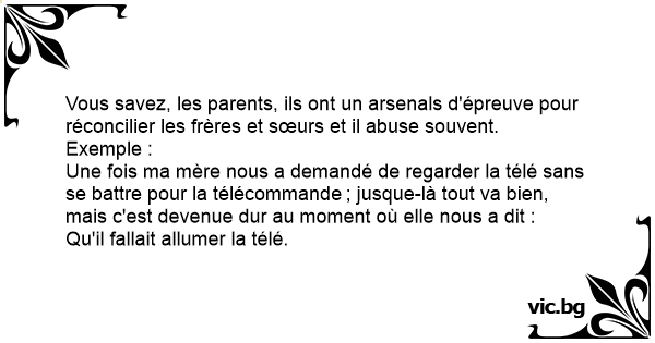 Une fois ma mère nous a demandé de regarder la télé sans se battre pour la télécommande ; jusque-là tout va bien, mais c'est devenue dur au moment où elle nous a dit :