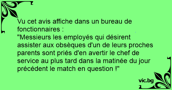 "Messieurs les employés qui désirent assister aux obsèques d'un de leurs proches parents sont priés d'en avertir le chef de service au plus таrd dans la matinée du jour précédent le match en question !"