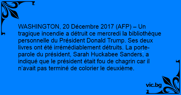 WASHINGTON, 20 Décembre 2017 (AFP) – Un tragique incendie a détruit ce mercredi la bibliothèque personnelle du Président Donald Trump. Ses deux livres ont été irrémédiablement détruits. La porte-parole du président, Sarah Huckabee Sanders, a indiqué que le président était fou de chagrin car il n’avait pas terminé de colorier le deuxième.