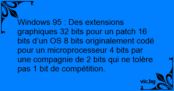 Windows 95 : Des extensions graphiques 32 bits pour un patch 16 bits d’un OS 8 bits originalement codé pour un microprocesseur 4 bits par une compagnie de 2 bits qui ne tolère pas 1 bit de compétition.