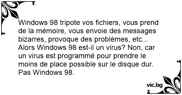 Windows 98 tripote vos fichiers, vous prend de la mémoire, vous envoie des messages bizarres, provoque des problèmes, etc... Alors Windows 98 est-il un virus? Non, car un virus est programmé pour prendre le moins de place possible sur le disque dur. Pas Windows 98.