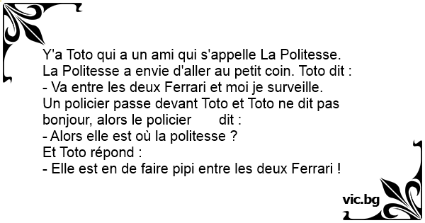 Y'a Toto qui a un ami qui s'appelle La Politesse. La Politesse a envie d'aller au petit coin. Toto dit :