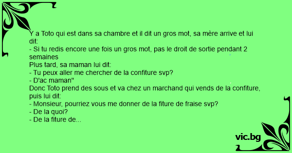 Y a Toto qui est dans sa chambre et il dit un gros mot, sa mère arrive et lui dit: