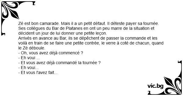 Zé est bon camarade. Mais il a un petit défaut. Il déteste payer sa tournée.